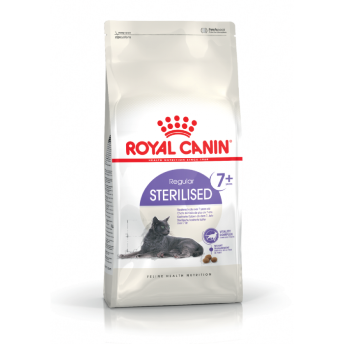 To help your neutered, adult cat face the first signs of ageing, ROYAL CANINยฎ Sterilised 7+ is enriched with targeted nutrients, including: green tea polyphenols, vitamin C, EPA and DHA. This vitality complex is highly beneficial for your cat and helps to support healthy body function.