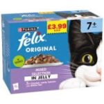 is a wet food specially designed for cats over 7 years old. It features poultry chunks cooked in succulent jelly. The pack includes 12 pouches, each weighing 85g. It provides a nutritious meal to support the health of senior cats.